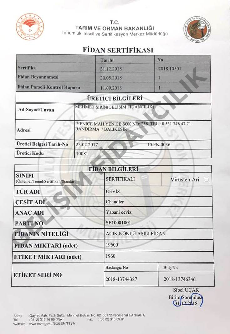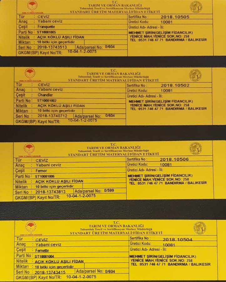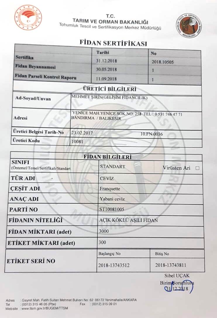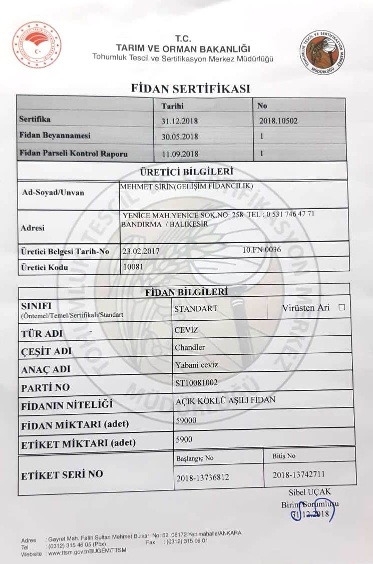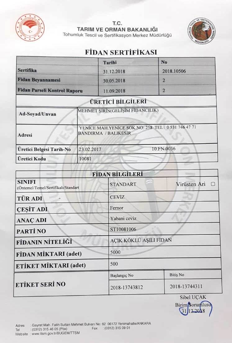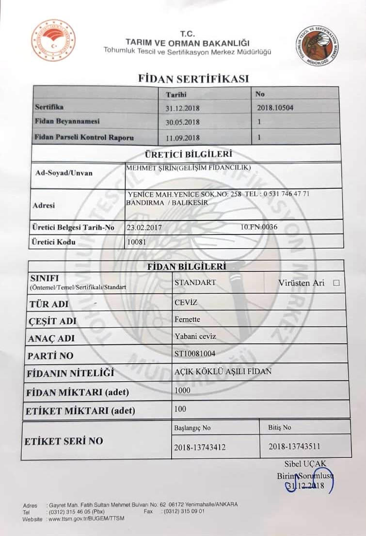 Chandler, fernor, fernette, franquette açık köklü ceviz fidanı üretim sertifikalarımız.